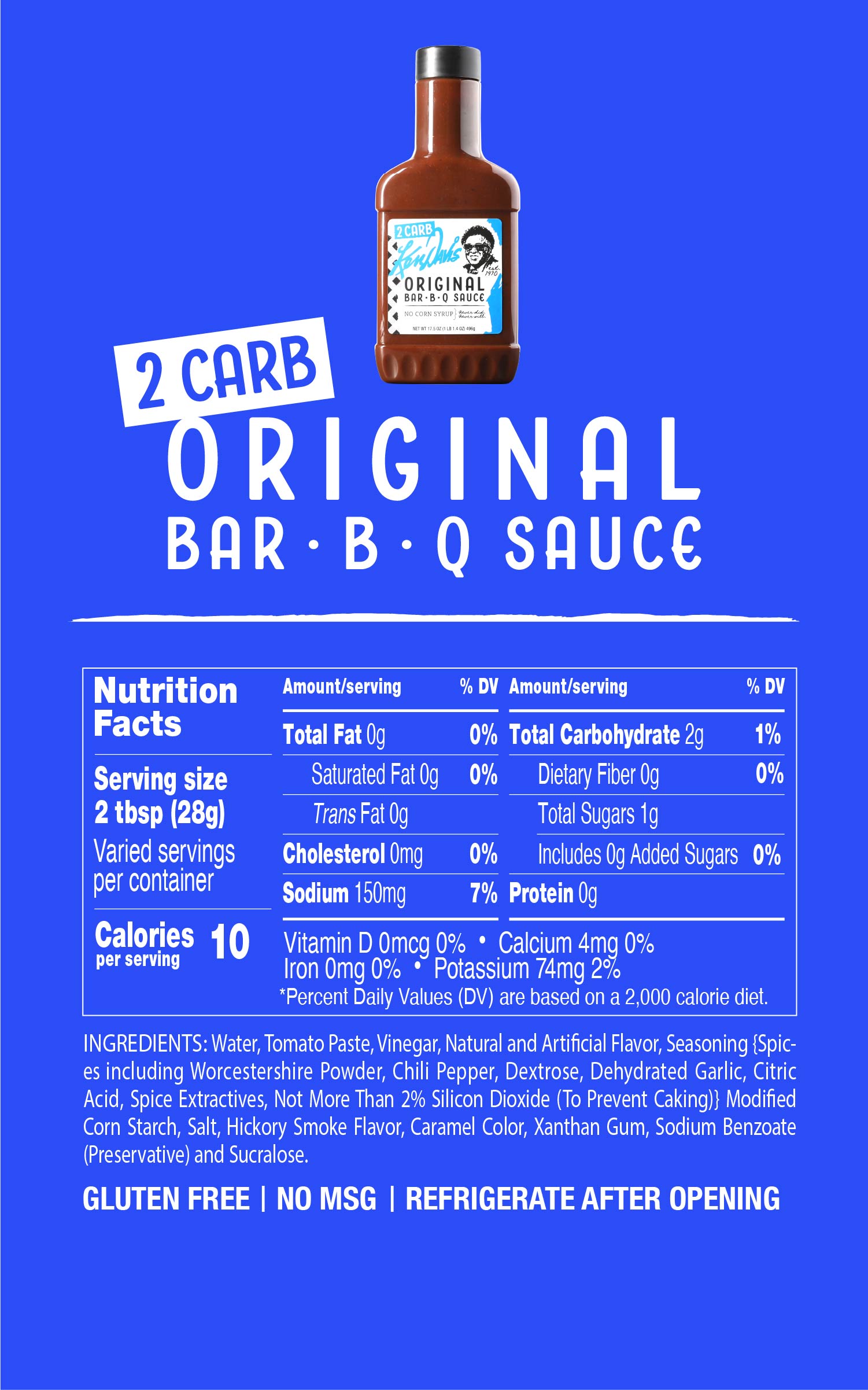 Size: 18.5 ozCut the carbs without compromising on taste. Our keto-friendly Original 2 Carb Bar-B-Q Sauce delivers the smokin’ rich flavor you love while respecting your dietary concerns. And if you’re watching your sodium, there’s more good news because Original 2 Carb also slashes the salt content.