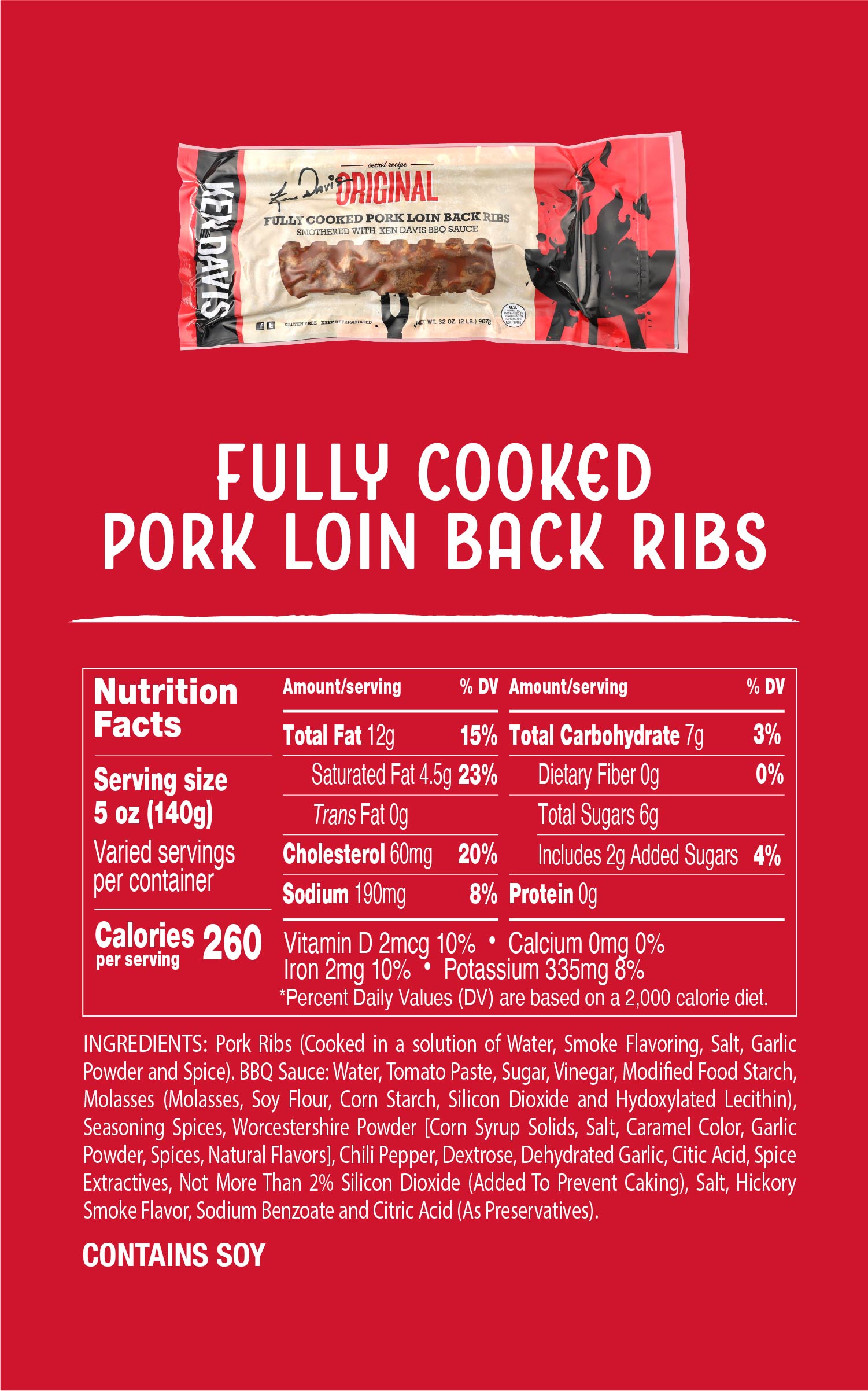 Size: 32 ozThe next time you crave authentic BBQ, perfectly smoked and irresistibly tender, just warm up and serve our Original BBQ Pork Loin Back Ribs – fully cooked and smothered with Ken Davis Bar-B-Q Sauce.