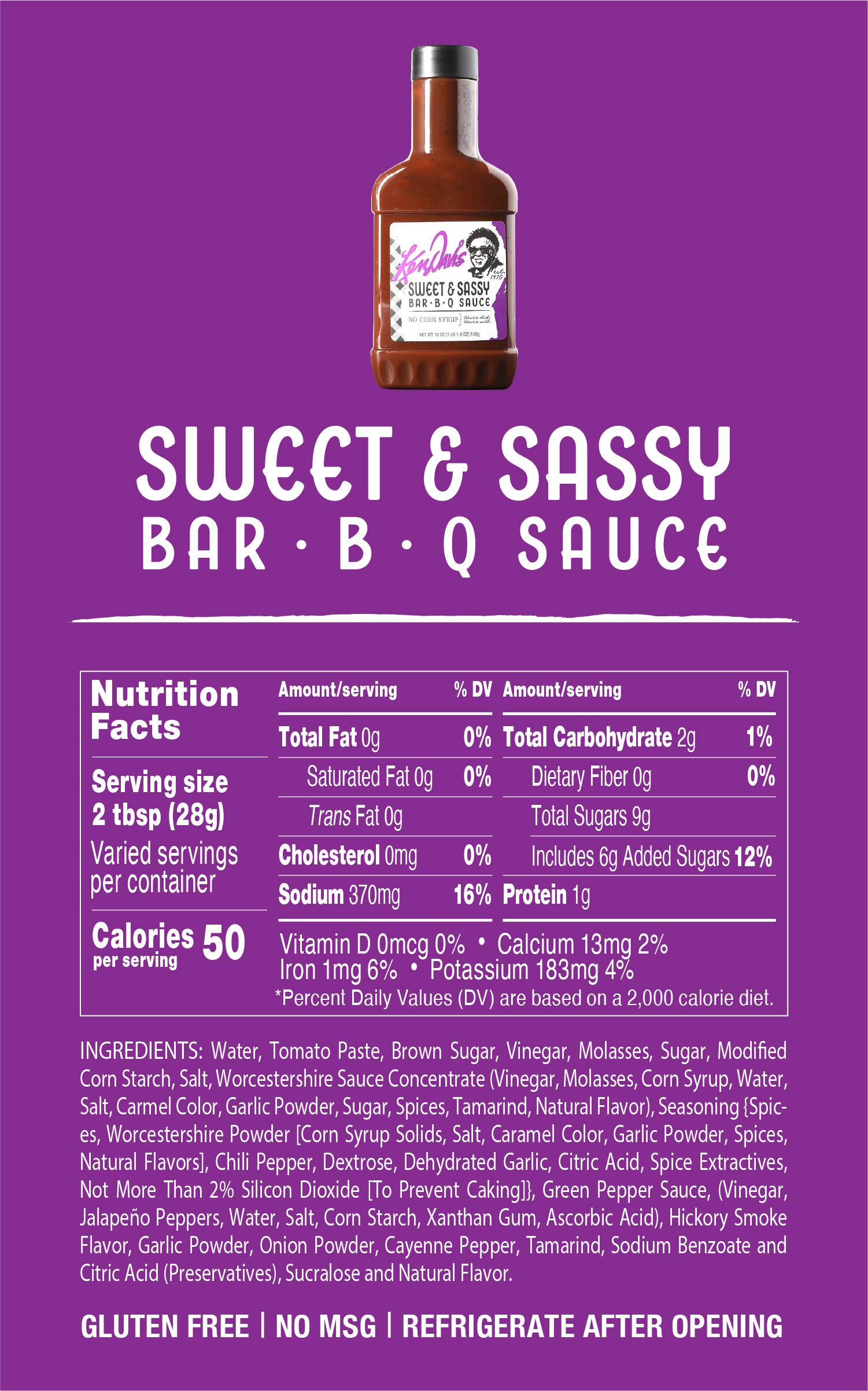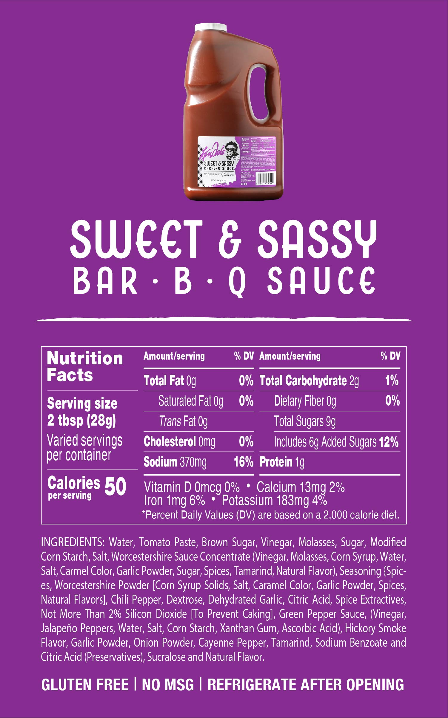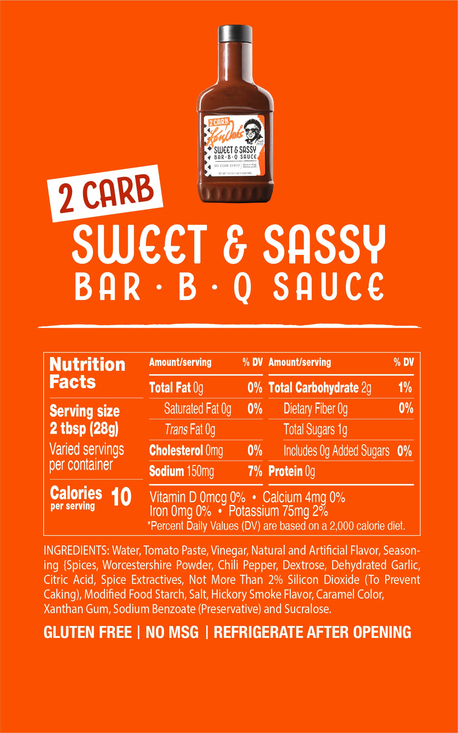Size: 18.5 ozA little smoky, slightly sweet and 100% sassy, this is the ideal choice for bringing balance to stronger-tasting BBQ’d favorites. And like all our offerings, Sweet & Sassy Bar-B-Q Sauce is gluten free, with half the carbs of most national brands, and it’s thick and rich for juicy, crispy caramelization.